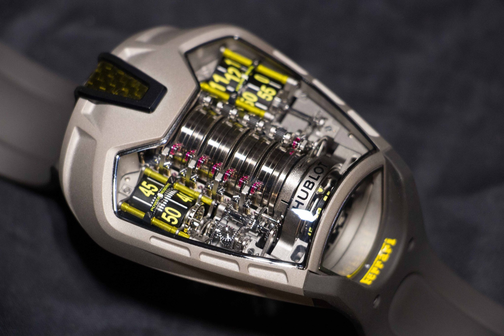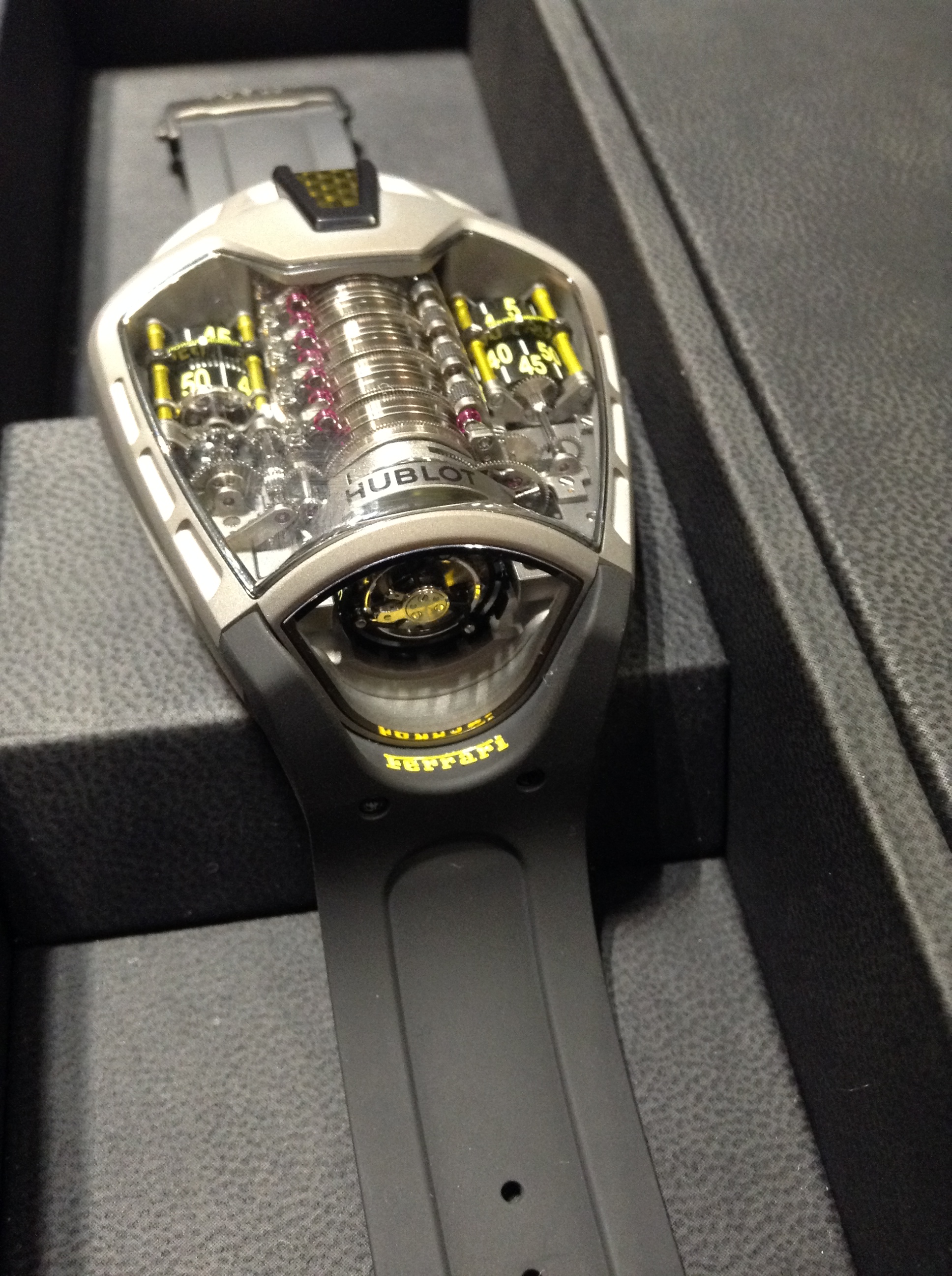 The MP-05 “LaFerrari” represents a very special series, entirely designed and developed – in parallel with the car – by the Hublot Manufacture engineers and watchmakers in tribute to “LaFerrari”. This stunning watch has a 50-day power reserve: a world record power reserve for a hand-wound tourbillion. The 12 barrels on the watch are arranged in sequence to mimic the V12 engine on the LaFerrari. A stunning watch mimicking a stunning car.